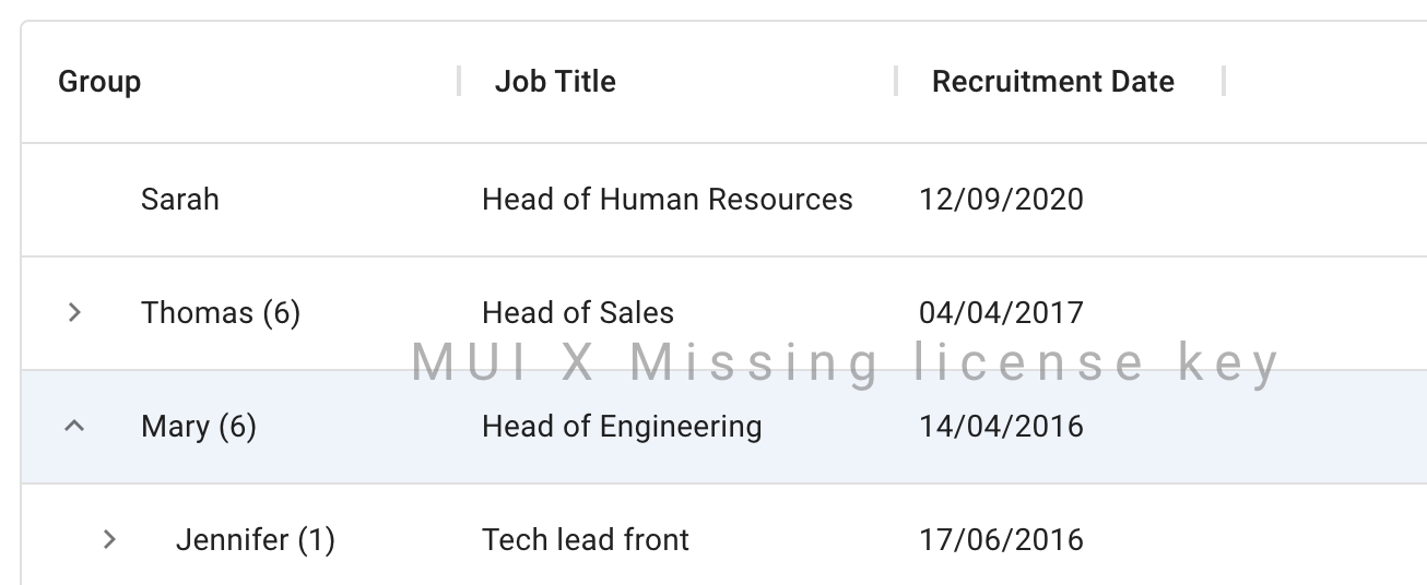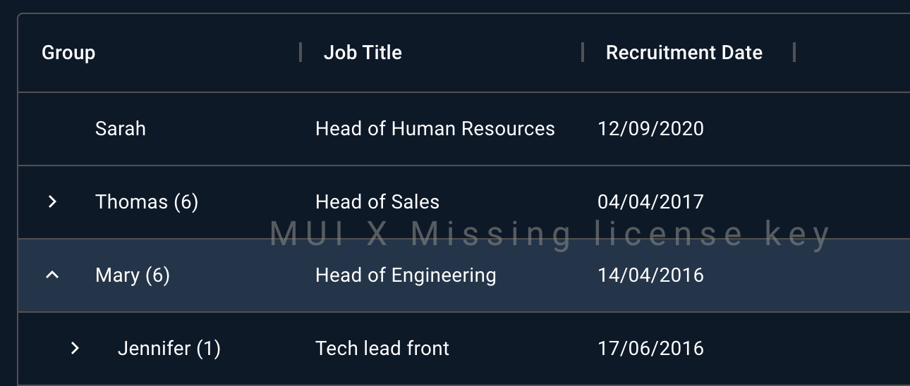 The Premium version of MUI X covers the most advanced features of the data grid, such as row grouping, Excel export, and aggregation, in addition to everything that's included in the Pro plan.